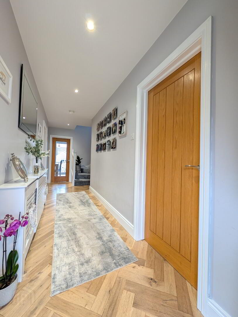 18’ 4” x 7’7” (5.60m x 2.31m at widest) Solid oak door with clear glass panel maximising natural light, tile floor, recessed spot lighting, range of high- & low-level solid contemporary kitchen units, laminated surfaces, white high gloss mono brick wall tile, stainless steel sink with mono tap and drainer, integrated appliances to include Beko dishwasher, Whirlpool ceramic hob and oven/grill with overhead extractor, fridge/freezer, uPVC French doors opening onto rear patio