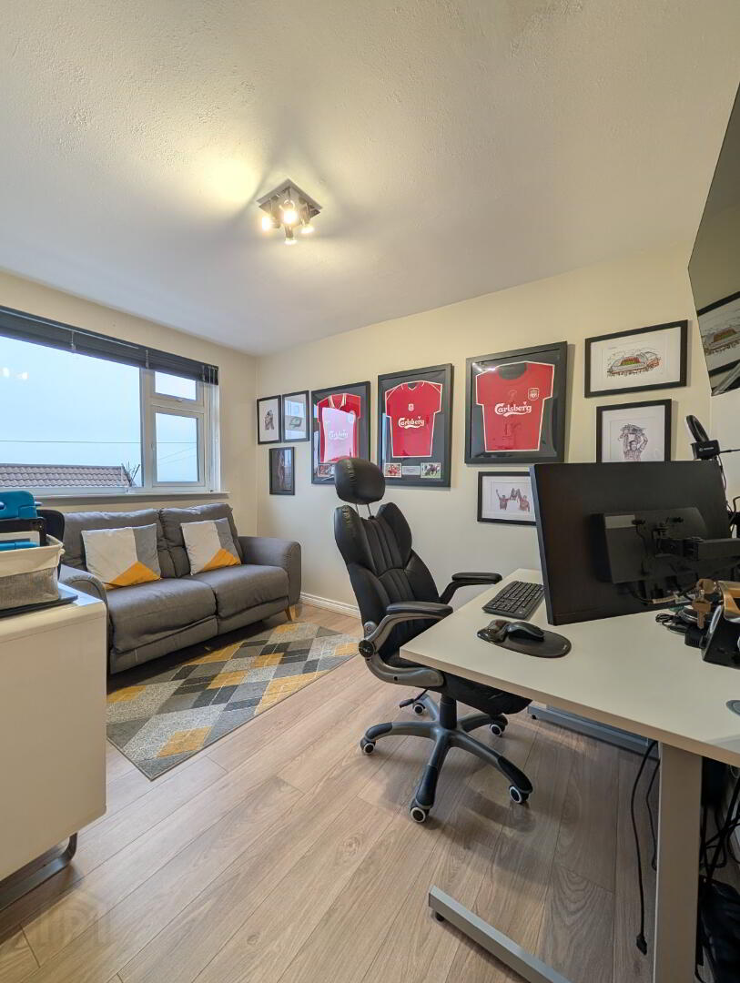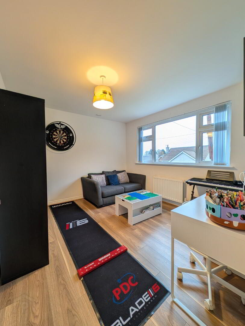 11’7” x 10’9” (3.54m x 3.28m at widest) Wooden effect laminated floor, TV point, roof mounted socket for projector, front facing