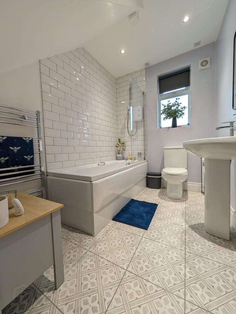 8’2” x 6’0” (2.49m x 1.82m at widest) Grey and white mosaic porcelain floor tile, white suite comprising button flush W.C, pedestal WHB with contemporary chrome mono tap, panel bath with overhead Triton electric shower, white high gloss mono brick wall tile, heated towel rail