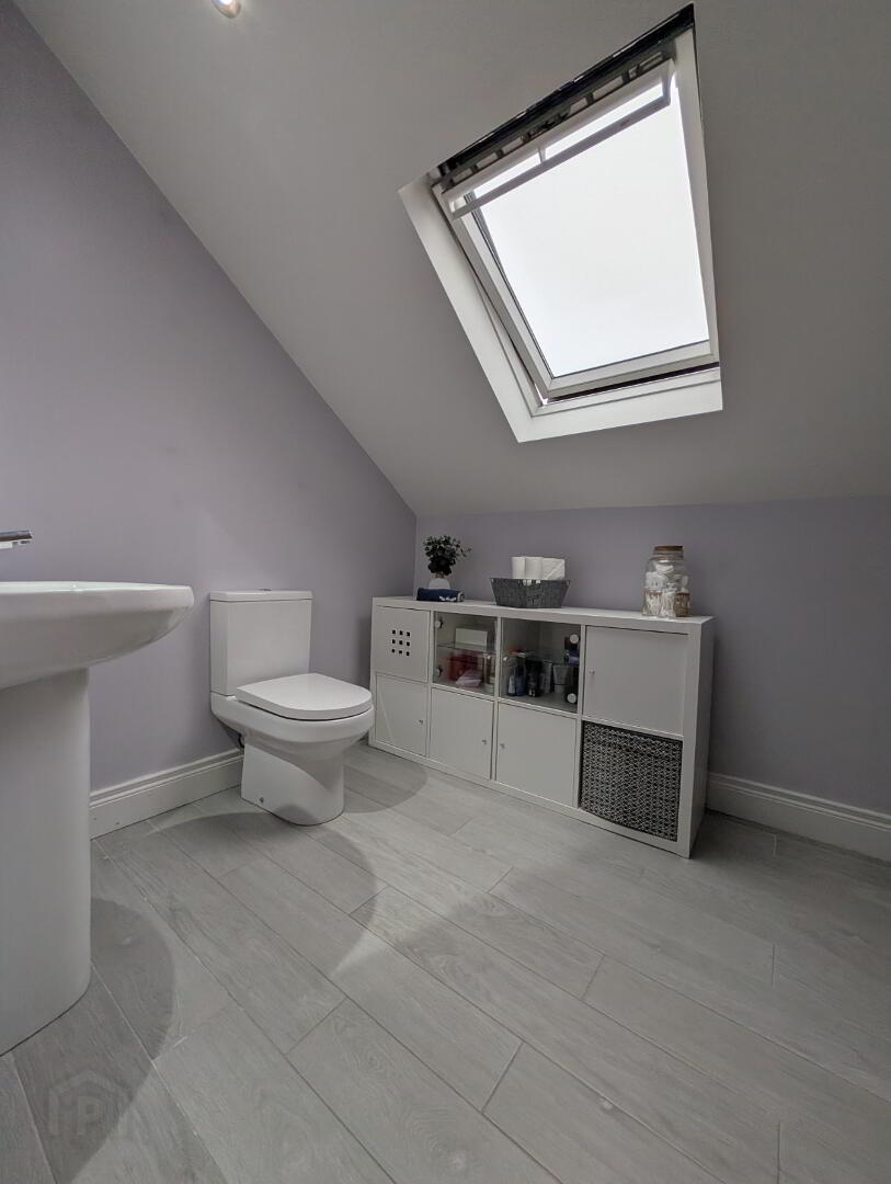 10’0” x 6’5” (3.06m x 1.95m at widest) Grey wooden plank effect porcelain floor tile, contemporary white suite comprising button W.C with, pedestal WHB with mono tap, shower enclosure fully tiled with contemporary high gloss mono brick wall tile and to include thermostatic power shower, chrome effect heated towel rail, recessed spot lighting, access to eaves, Velux window