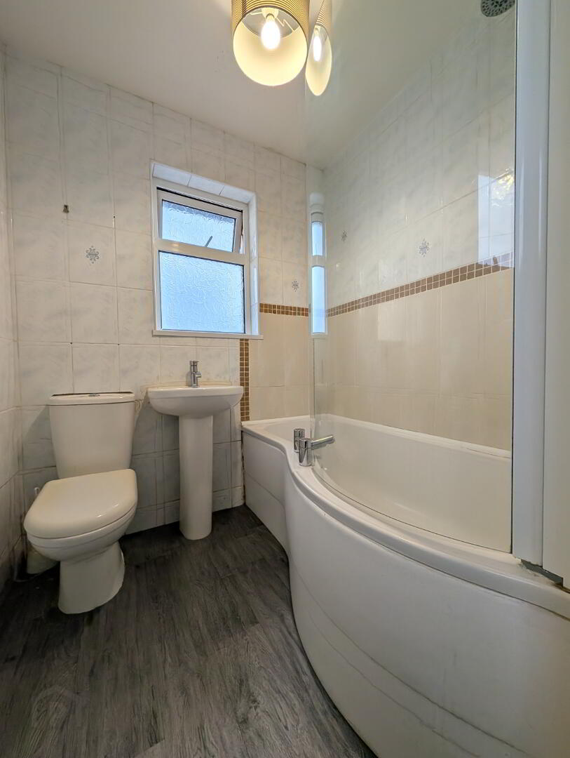 5’ 6” x 5’ 3” (1.68m x 1.59m at widest) White suite to include button flush WC, pedestal WHB with mixer tap & panel bath with overhead shower and screen