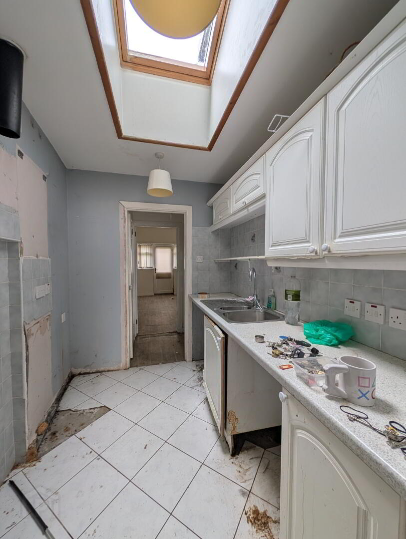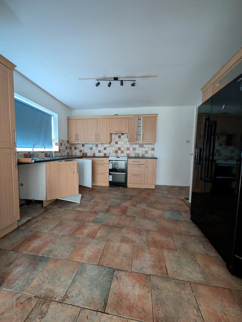 8’ 0” x 4’ 11” (2.44m x 1.49m at widest) Tile floor, range of high- and low-level units, stainless steel sink with drainer, through to