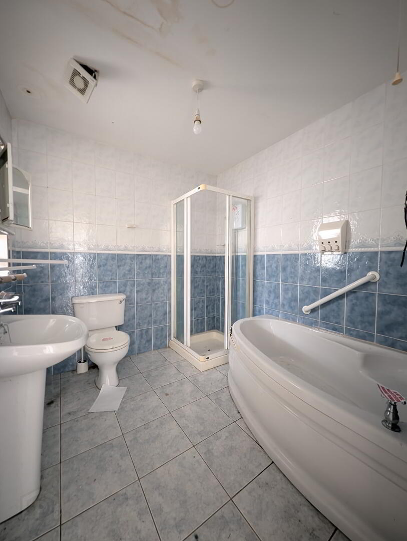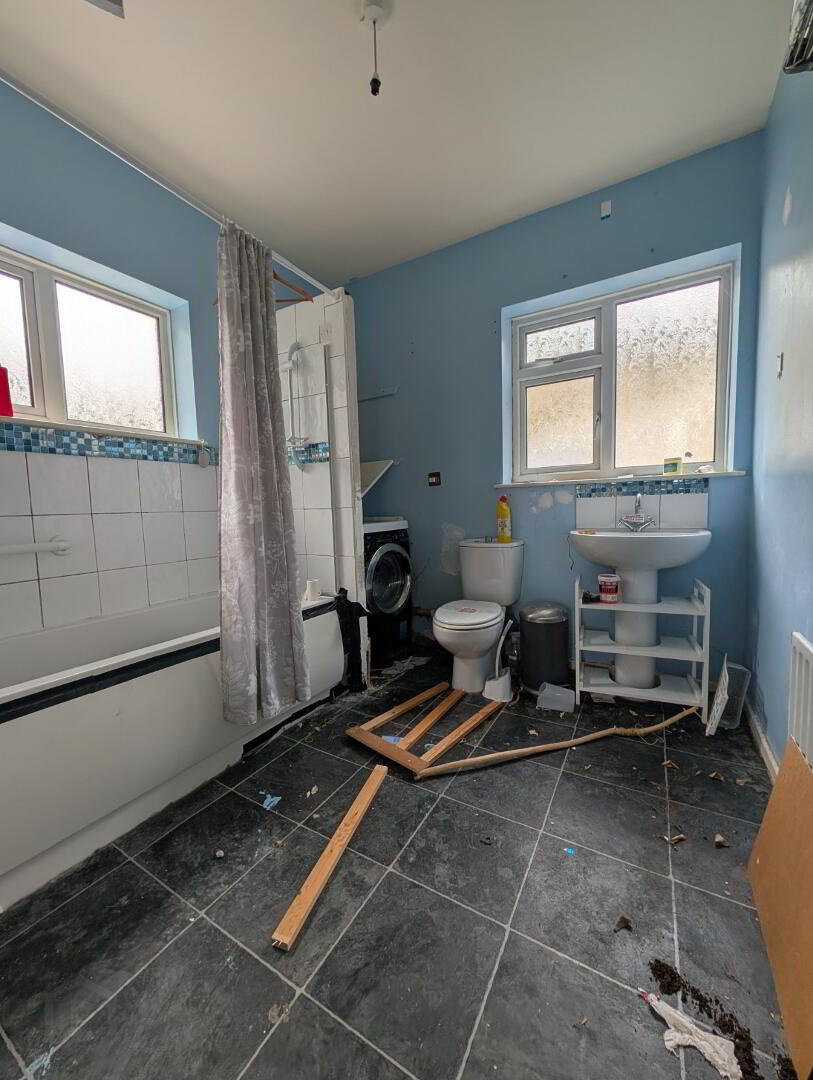 8’ 0” x 7’ 5” (2.44m x 2.27m at widest) White suite to include low flush WC, pedestal WHB, corner bath, shower cubicle with electric shower, fully tiled