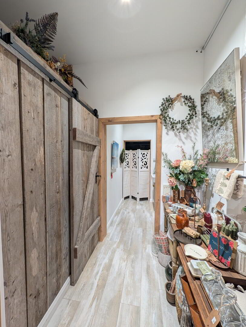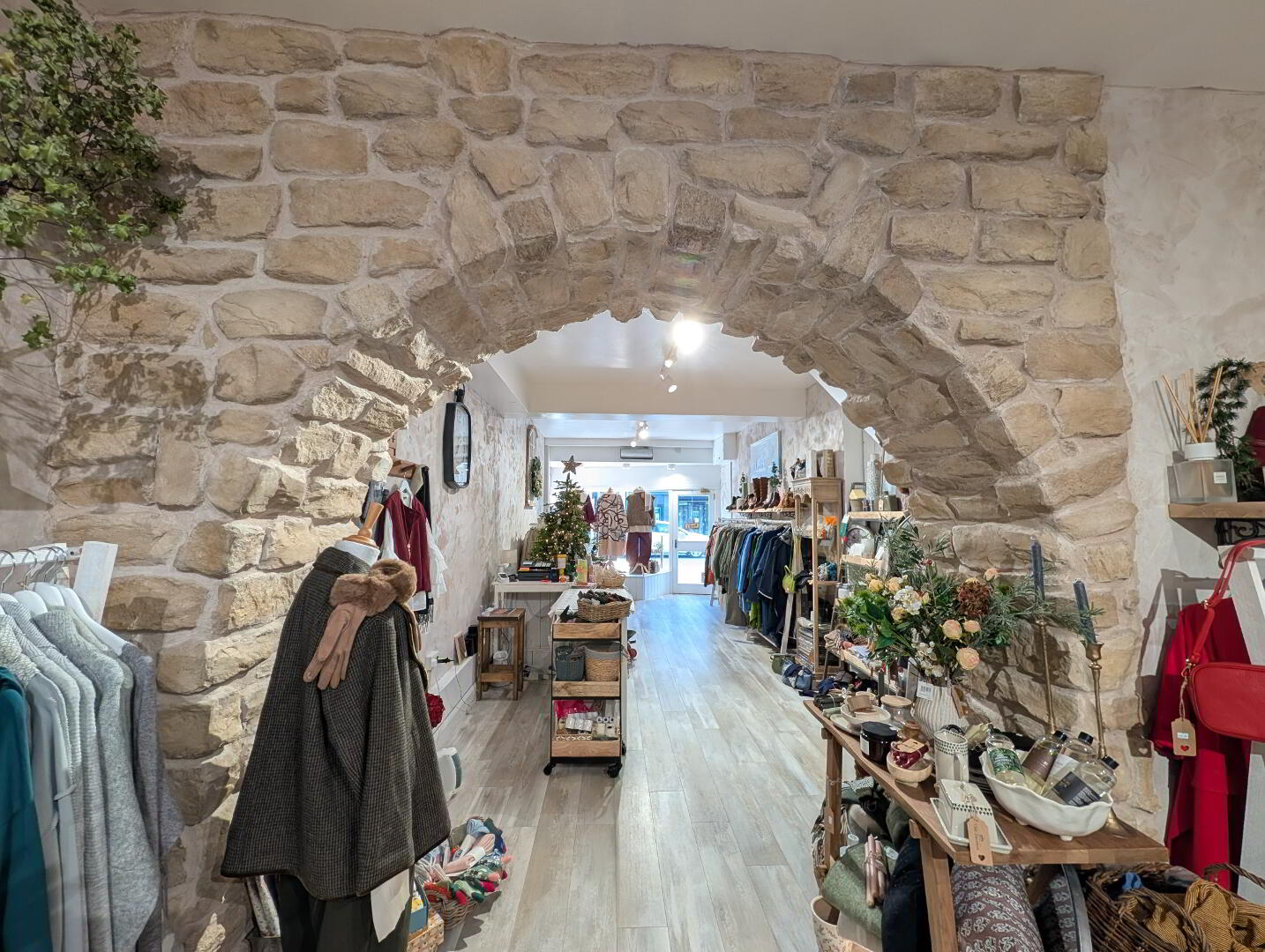 Prominent shop front with shutter, glazed hardwood door opening into bright and airy retail space with store to the rear