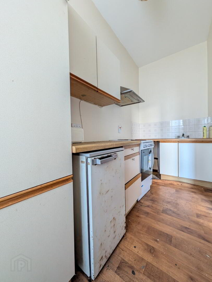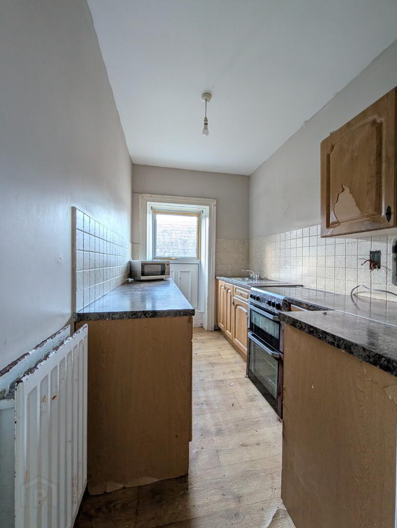 9’ 3” x 6’ 4” (3.93m x 2.40m at widest) Galley kitchen with a range of high- and low-level kitchen units, laminated work surfaces, stainless steel sink
