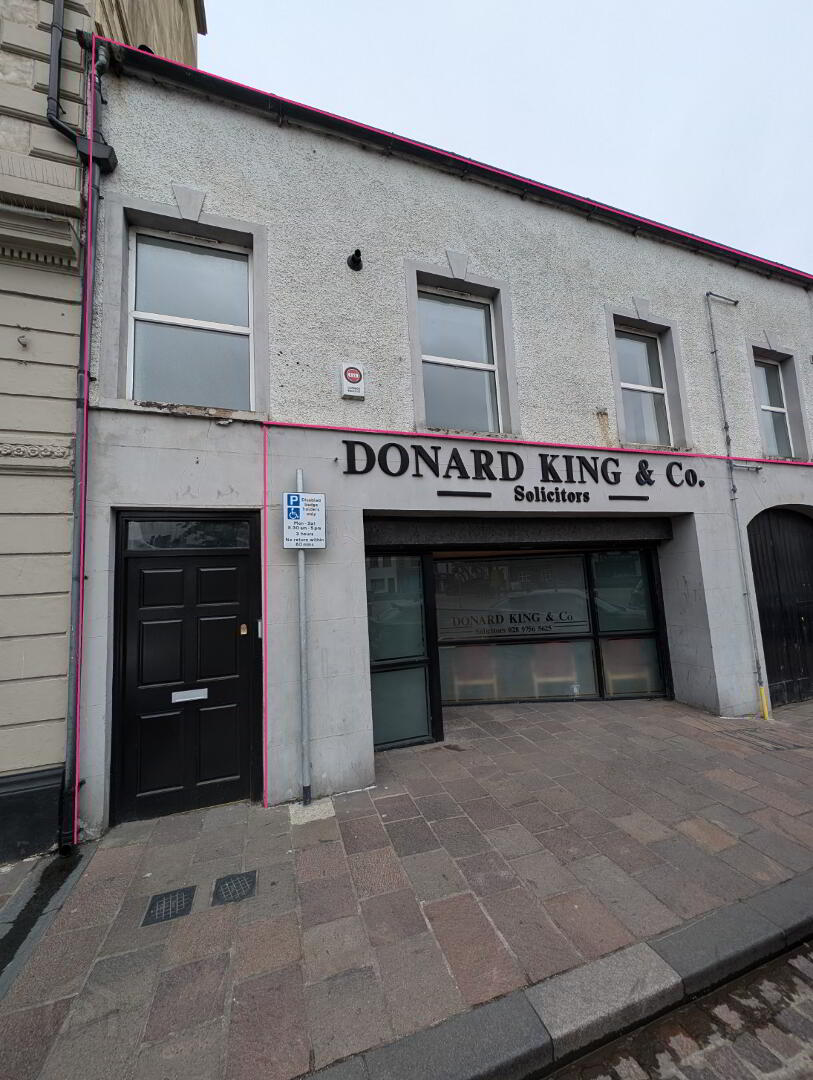 Hardwood door opening into communal hallway and staircase leading to apartments