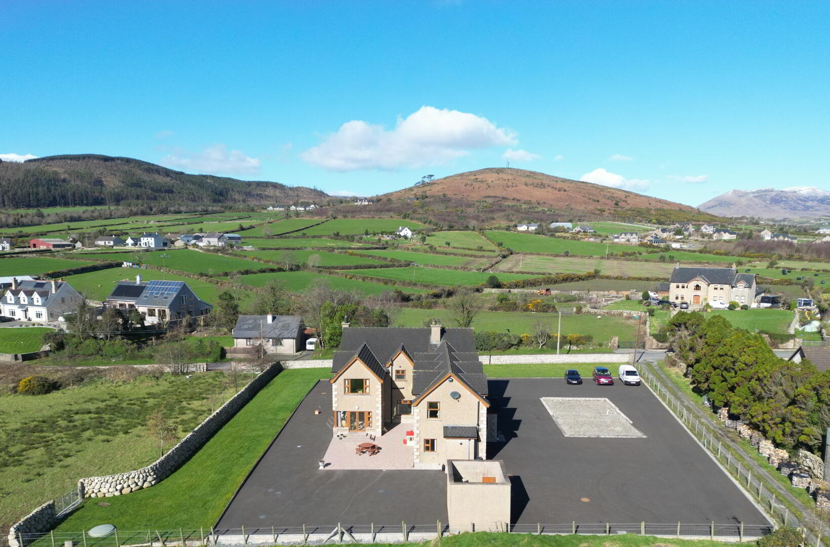 Extensive wrap around gardens with manicured lawns, Tobermore block paved patio area, hand built Mourne dry stone boundary wall, foundations in situ for detached double garage, expansive parking area laid in tarmacadam